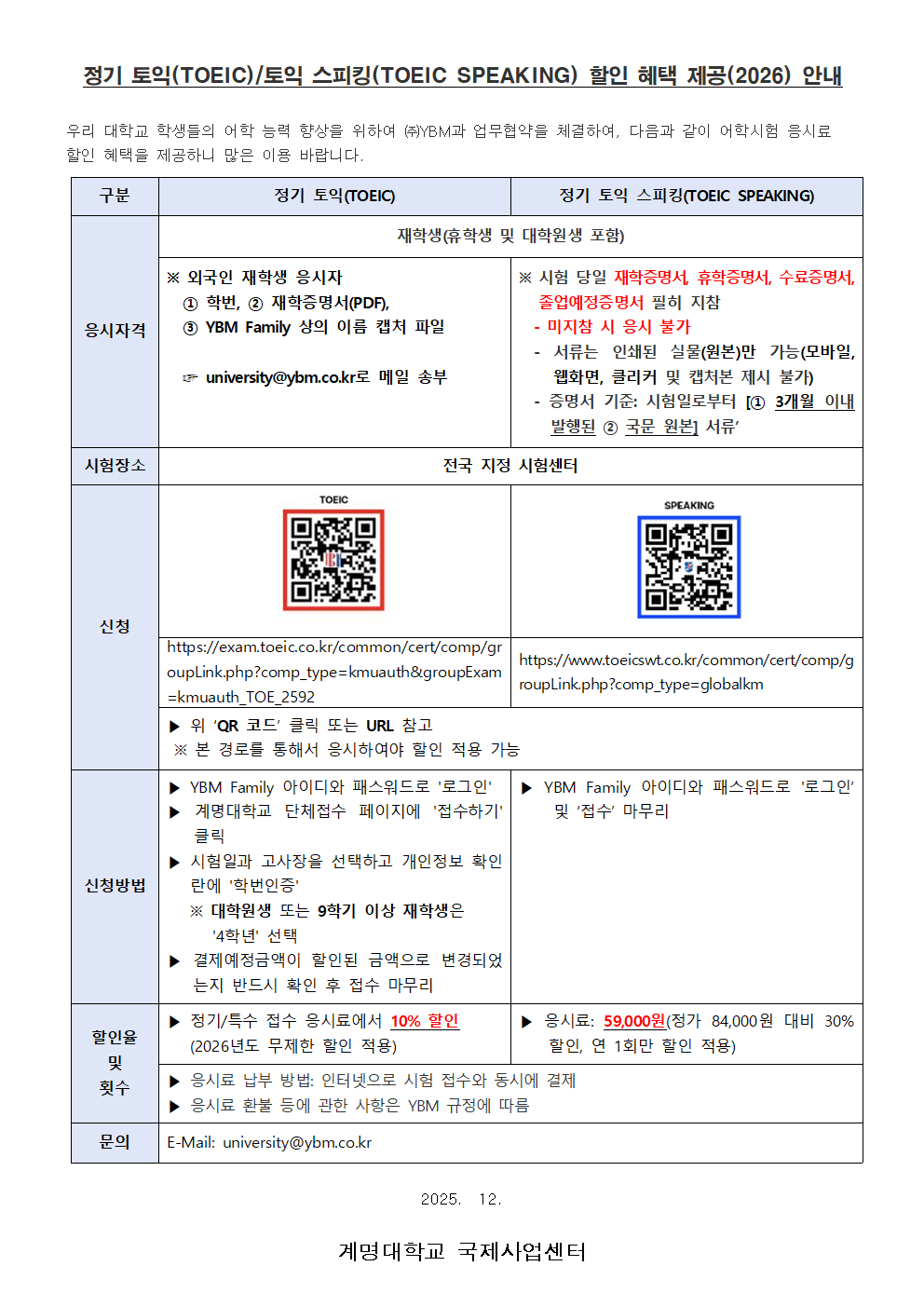 정기 토익(TOEIC) 및 토익 스피킹(TOEIC SPEAKING) 응시료 할인 제공 안내
